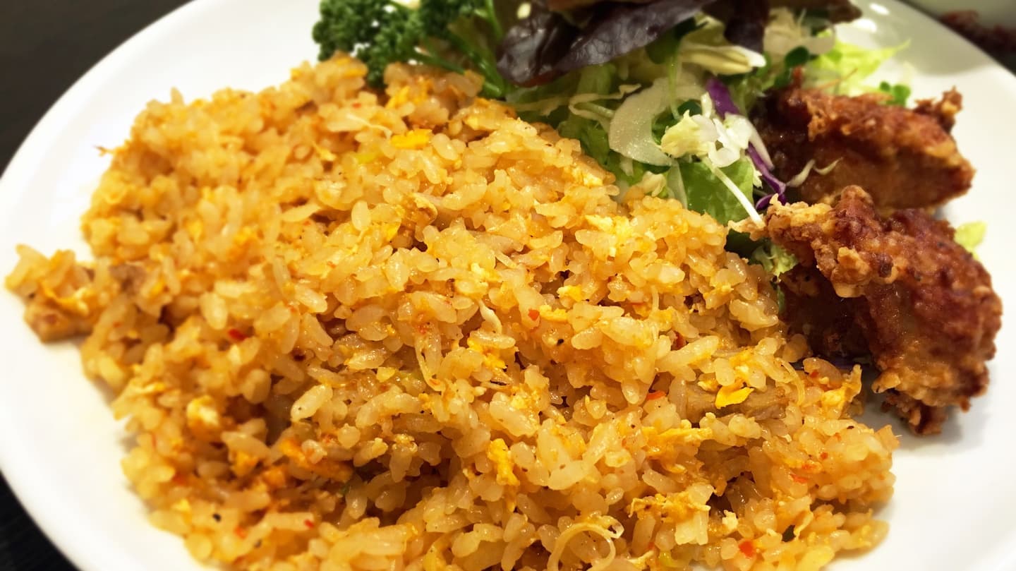ピリ辛に炒めたチャーハンに、サラダ、唐揚げ2個、スープが付きます。ニンニク風味の辛いチャーハンは病みつき間違いなしの人気メニューです。