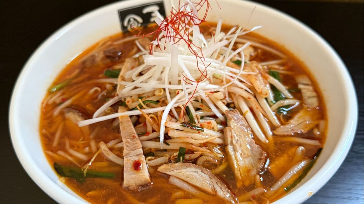 ニラともやしを唐辛子で炒めトッピング。一二三定番の辛口ラーメンです。辛さ増しは、2倍(+100円)、3〜5倍(+200円)から選べますが、3〜5倍は激辛になりますのでご注意ください。